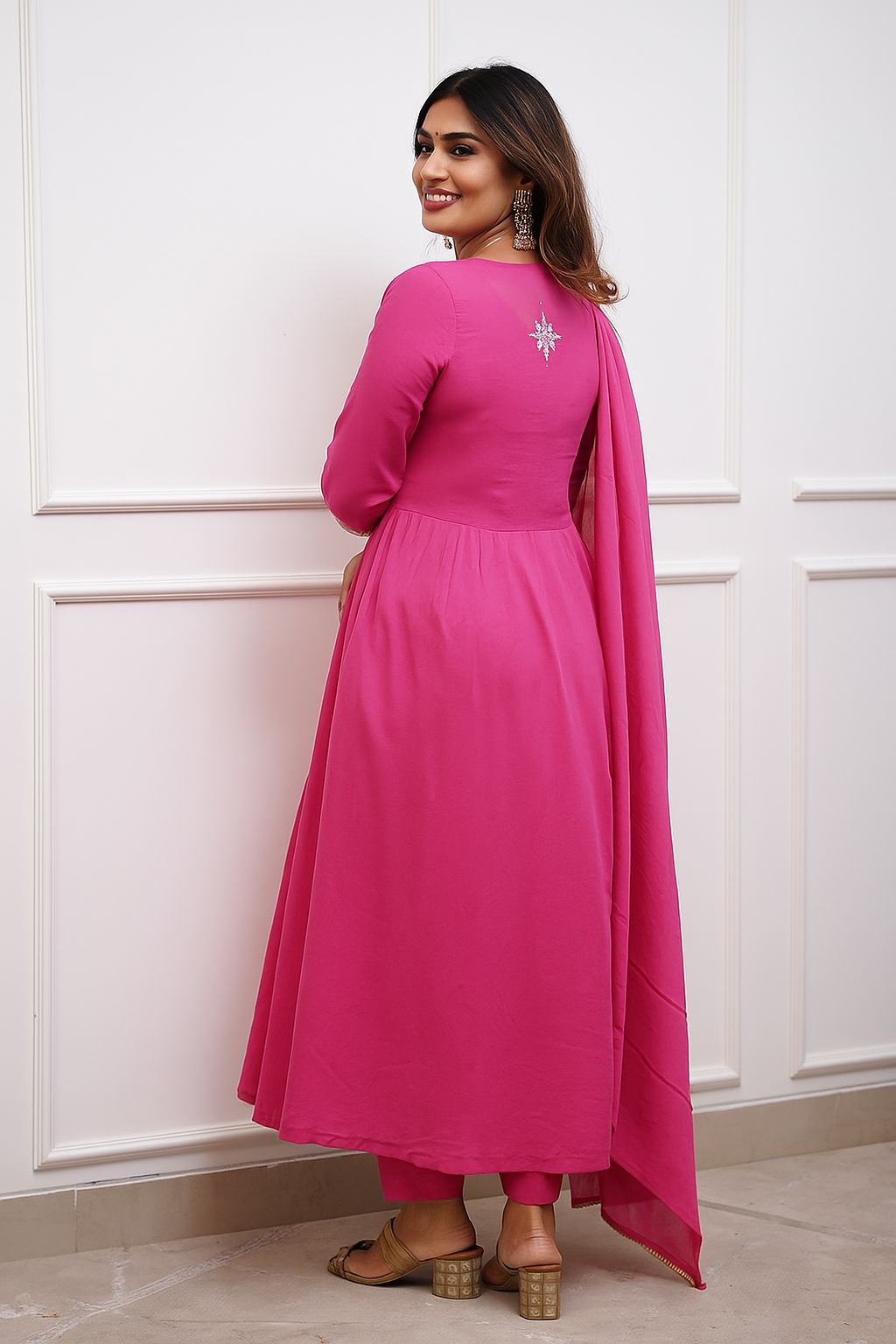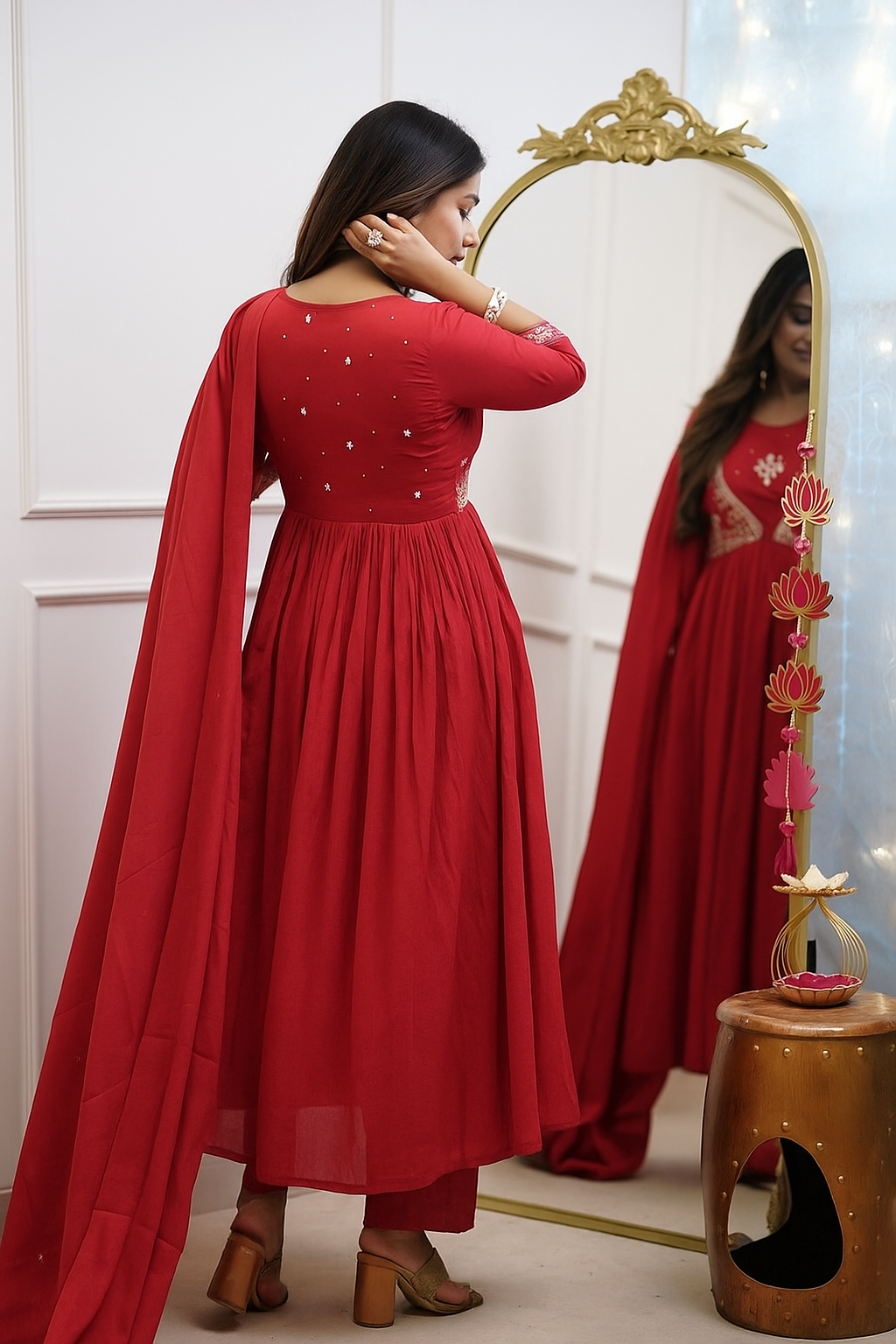 Description – Radiate grace in this stunning Red Anarkali-style kurta set, crafted in a soft silk blend for that royal festive vibe. The elegant round neckline is beautifully enhanced with delicate gold thread and mirror embroidery, while the flowing silhouette of the kurta adds a touch of traditional grandeur. The ensemble is completed with a matching dupatta that features a subtle embroidered border. This outfit blends elegance with tradition, making it perfect for wedding functions, poojas, or festive evenings