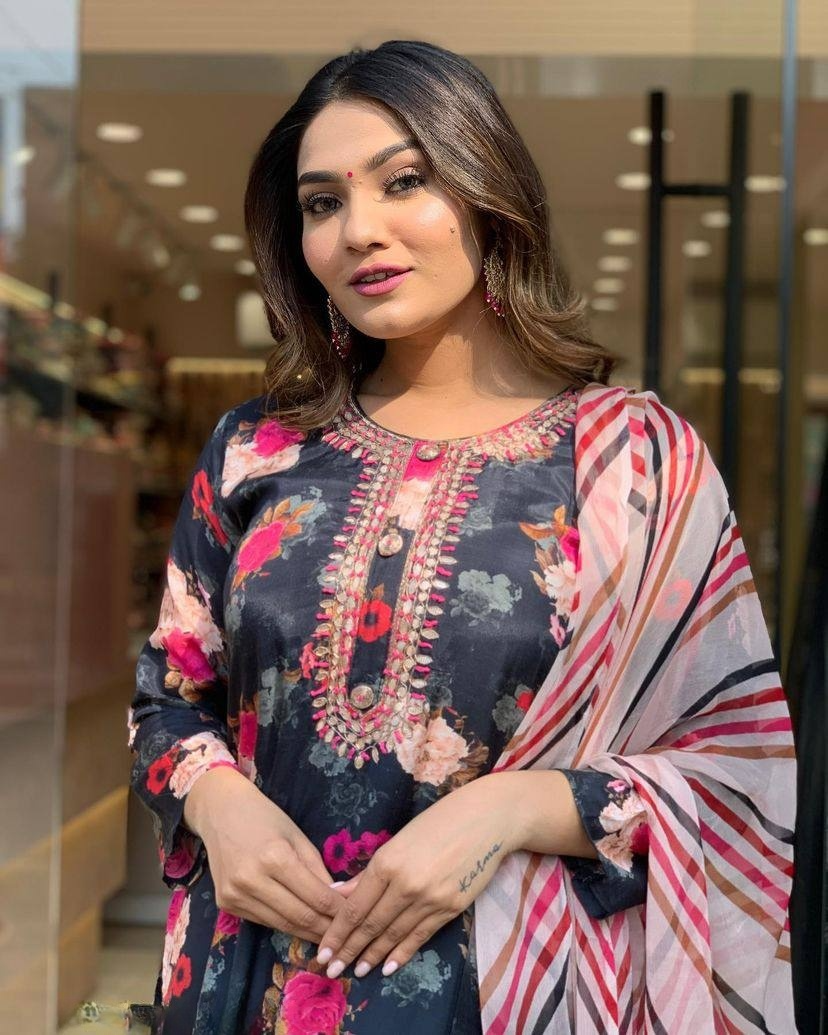 Description – Black kurta adorned with multi-colored floral prints and neckline embroidery, styled with a striped dupatta featuring hints of floral accents. Perfect fusion of tradition and modernity.