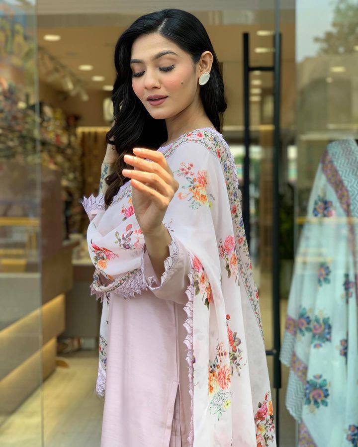 Description – A soft pastel pink kurta set designed with lace detailing on the hemline and sleeves. Paired with a lightweight floral printed dupatta, this look is graceful and versatile for both day and evening occasions.