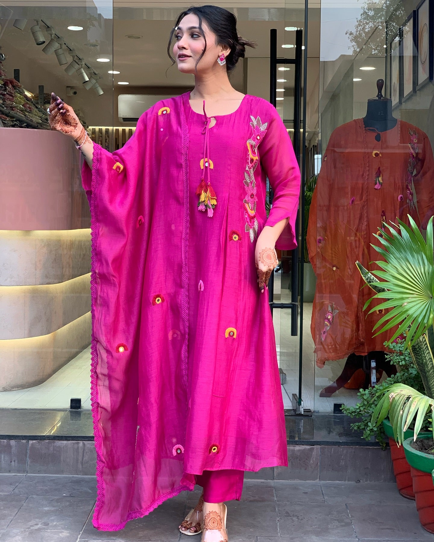 Description – Bright and beautiful, this fuchsia pink kurta set is designed with playful embroidery and tassel detailing at the neckline. Perfect for mehendi, haldi, or festive celebrations, this piece adds a touch of youthful vibrance to your ethnic wardrobe.
