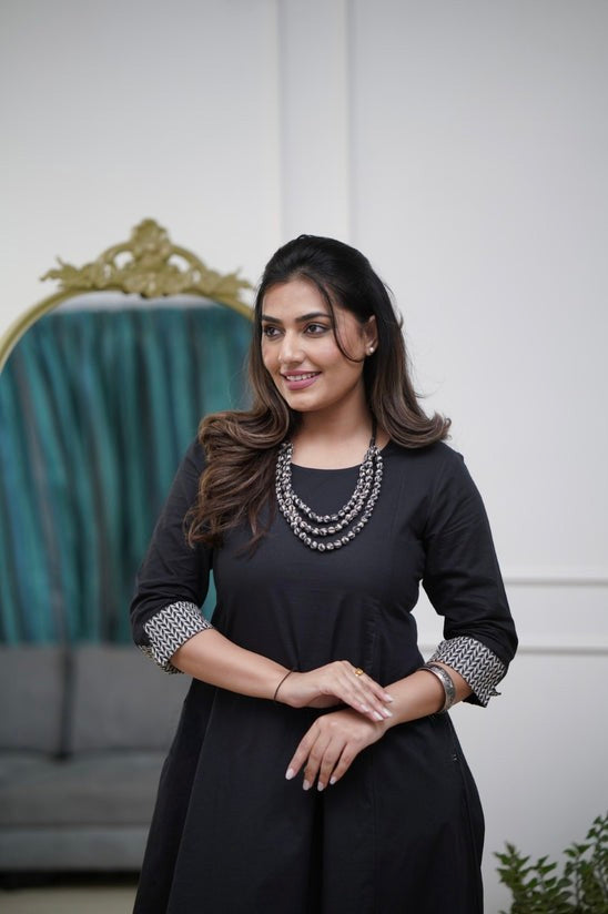 Description – A chic black kurta with checked cuff detailing, styled with wide-legged palazzo pants. Minimal yet stylish, ideal for both casual and office wear.