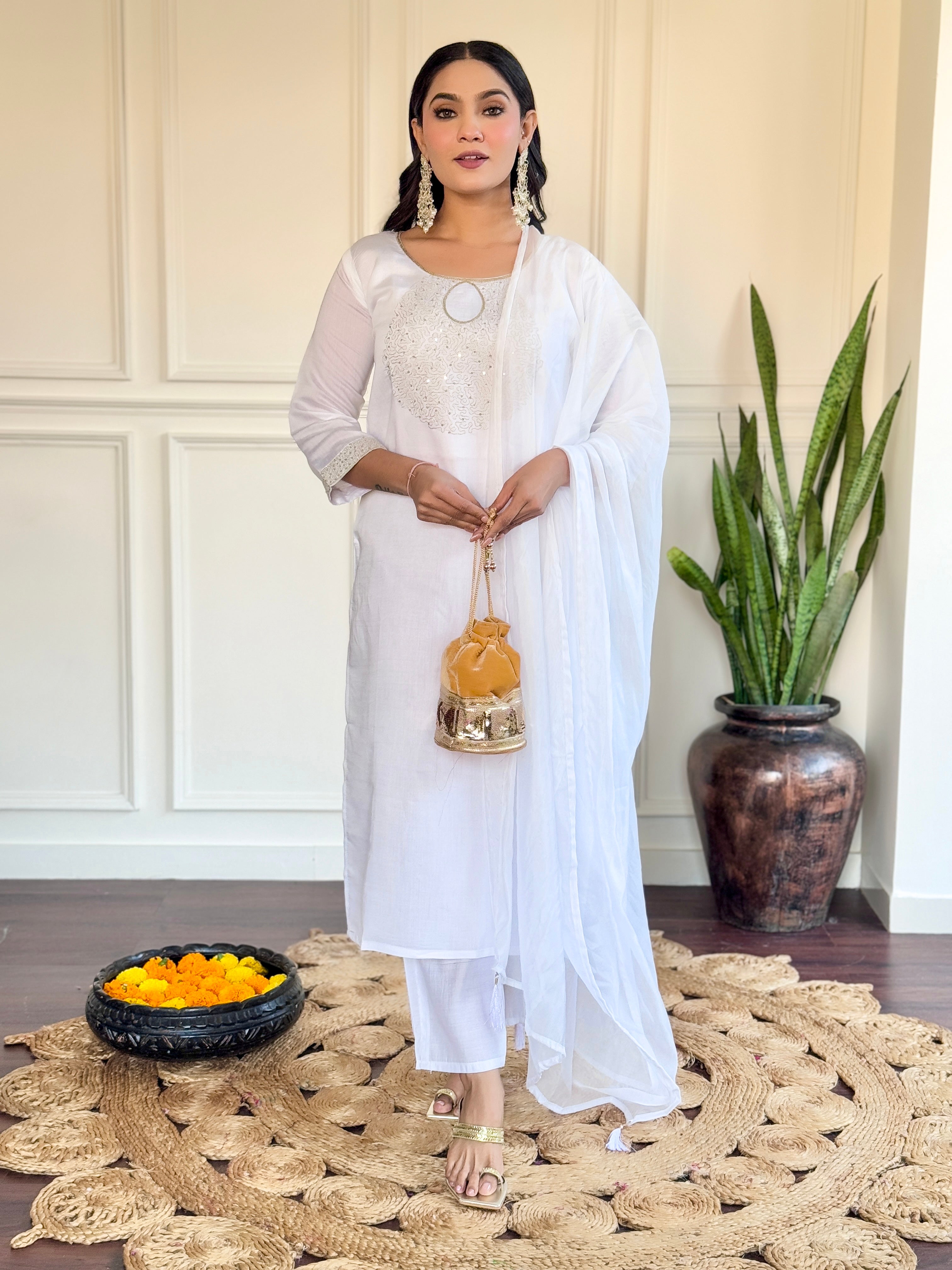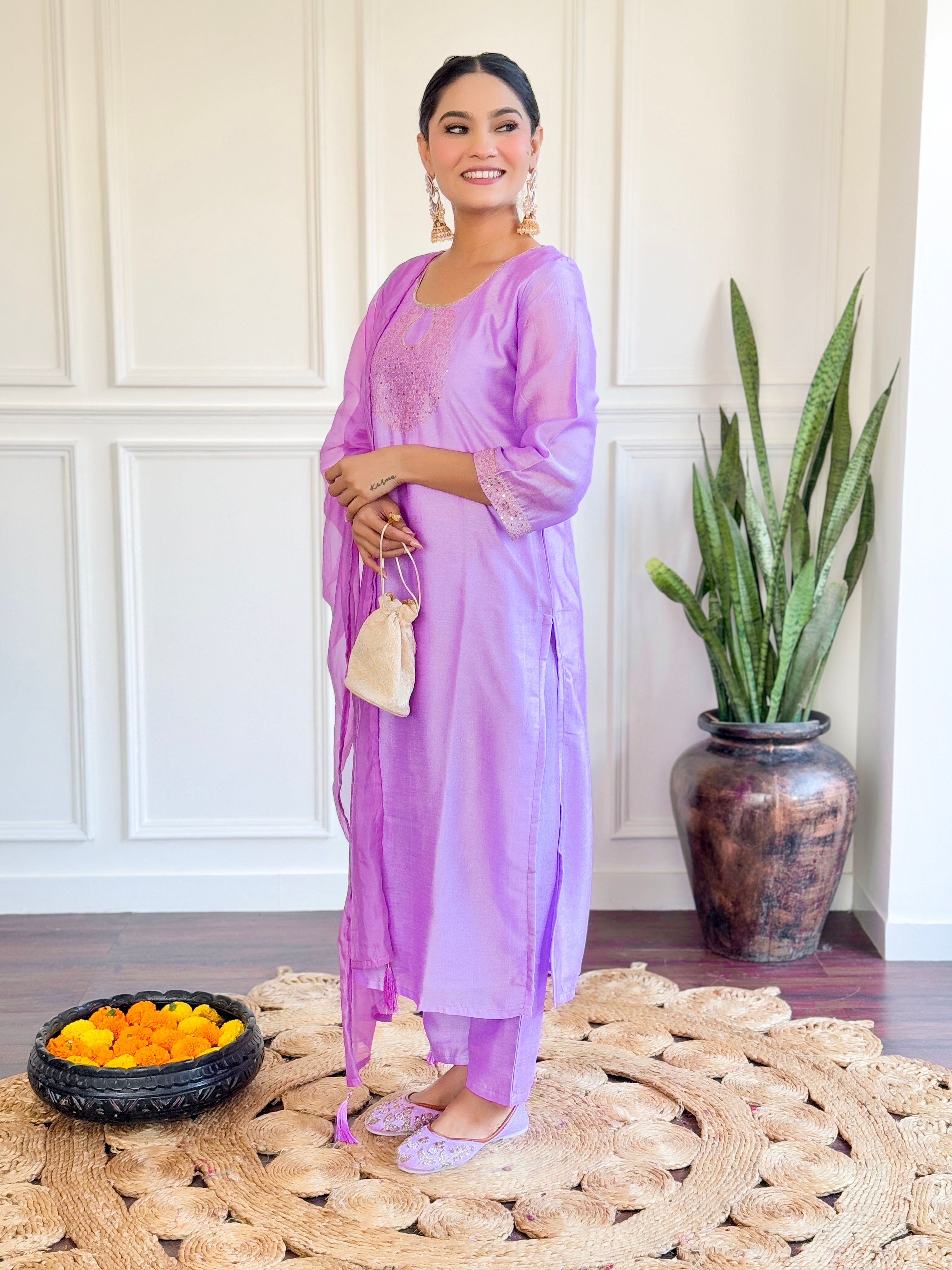 Description – Minimal yet glamorous, this lilac kurta set comes with delicate sequin embroidery on the yoke. Paired with a plain dupatta, this look blends simplicity with sparkle.