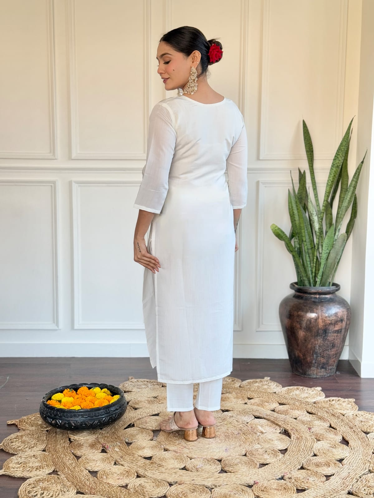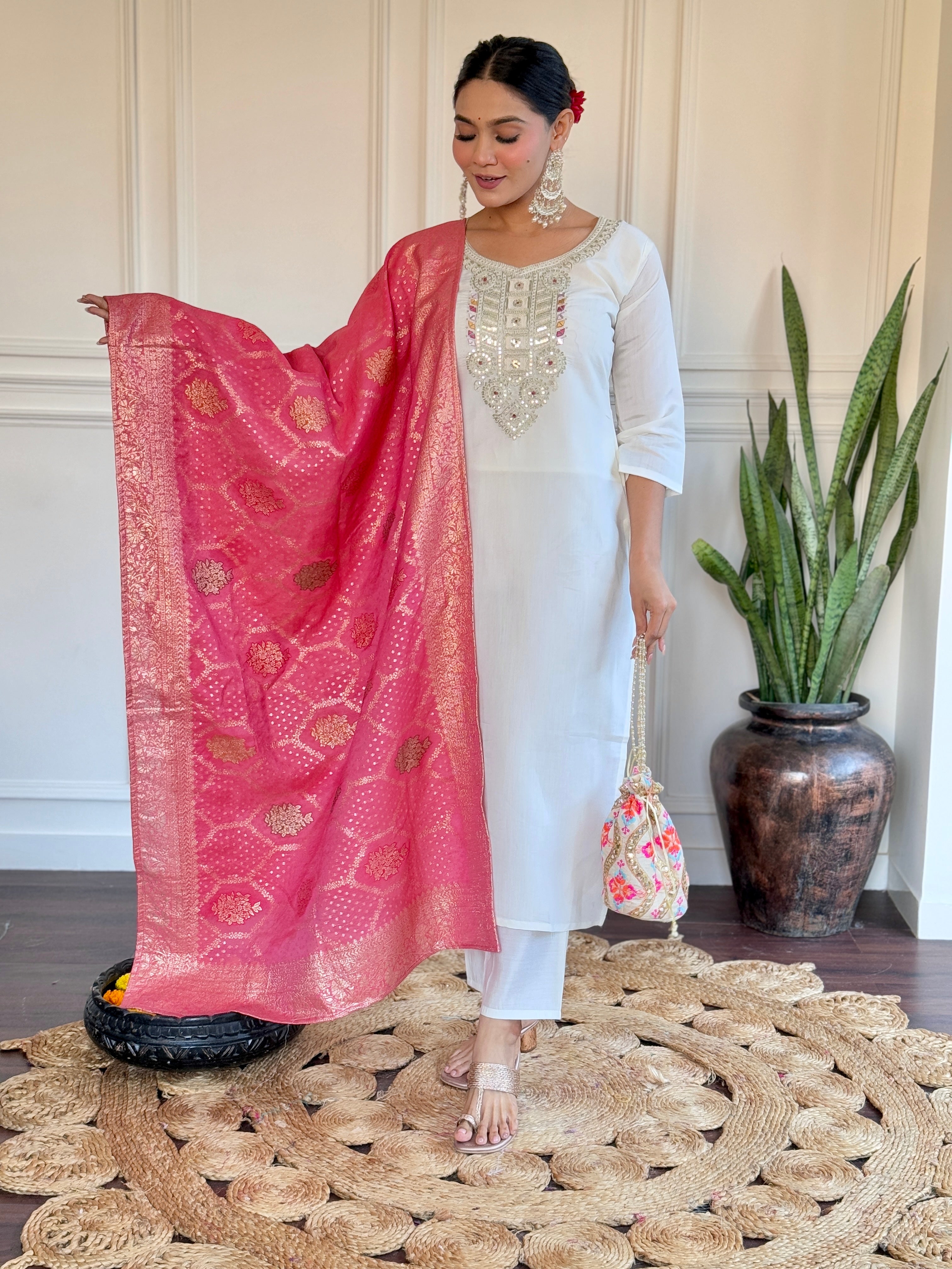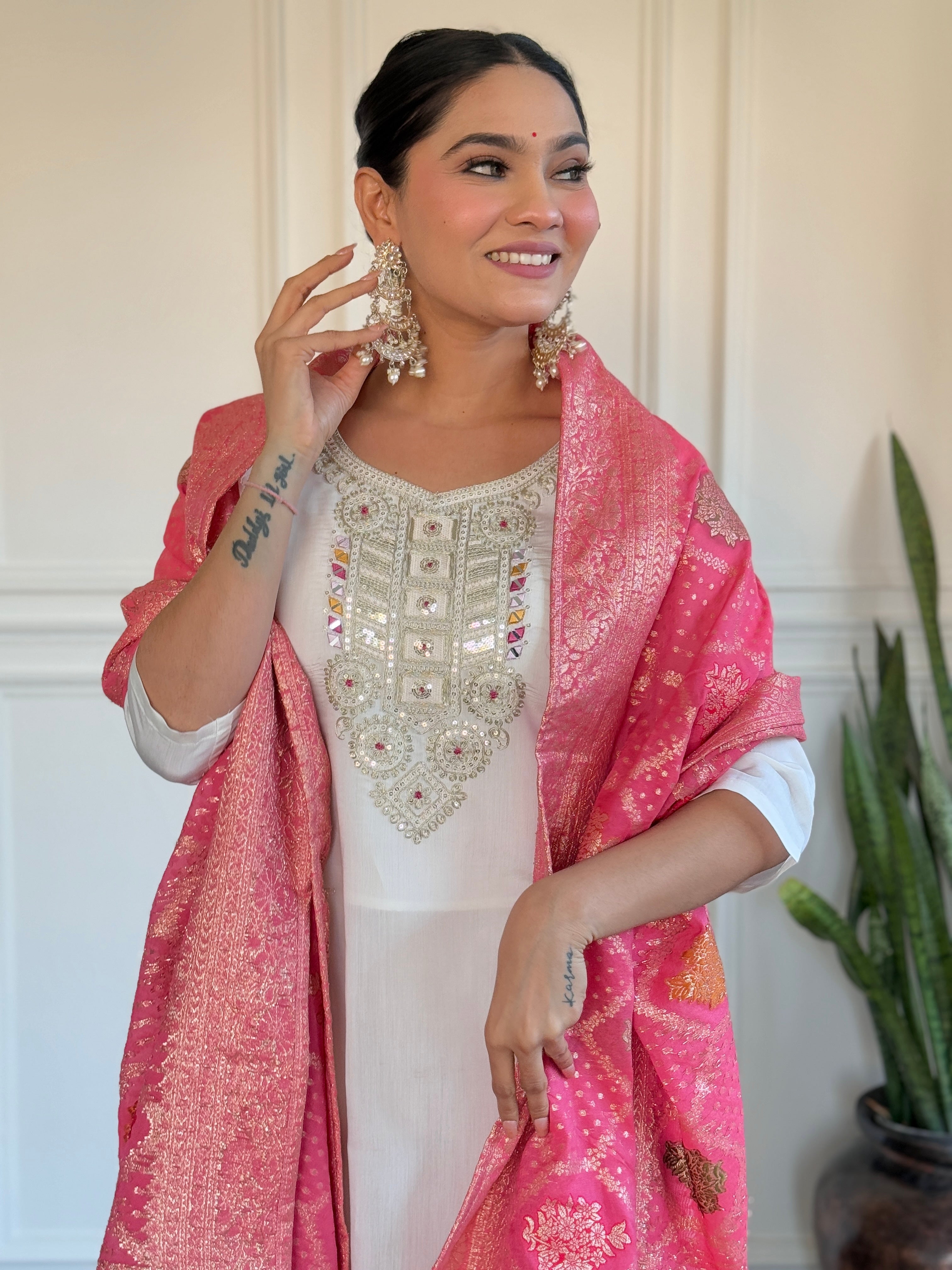 Description – Graceful and elegant, this white kurta set with mirror and thread embroidered neckline comes paired with a luxurious rani pink Banarasi dupatta woven with golden motifs. Perfect for festive gatherings and traditional functions.