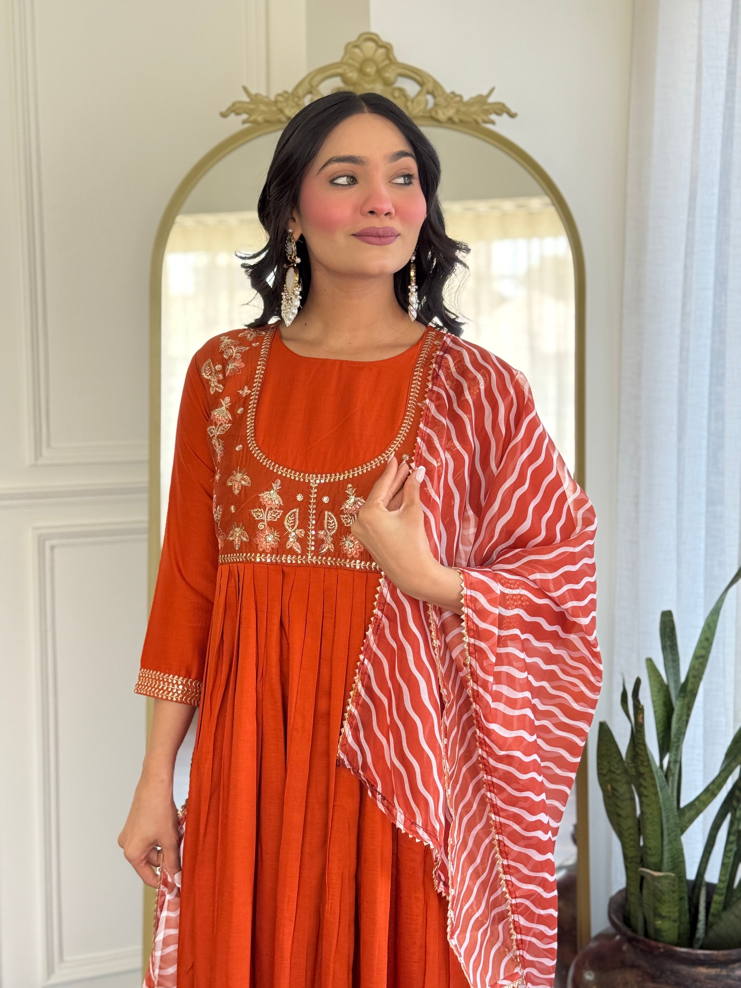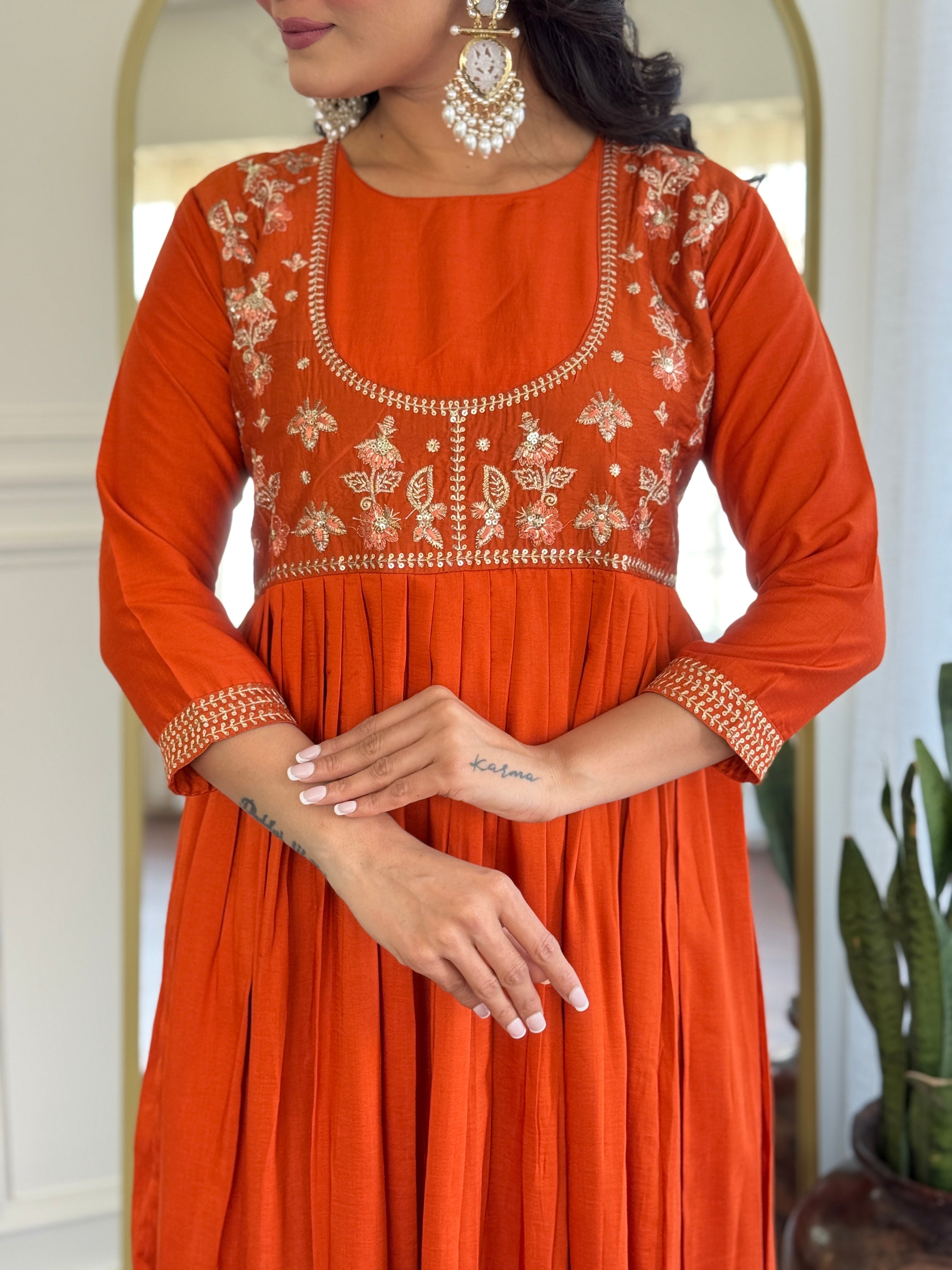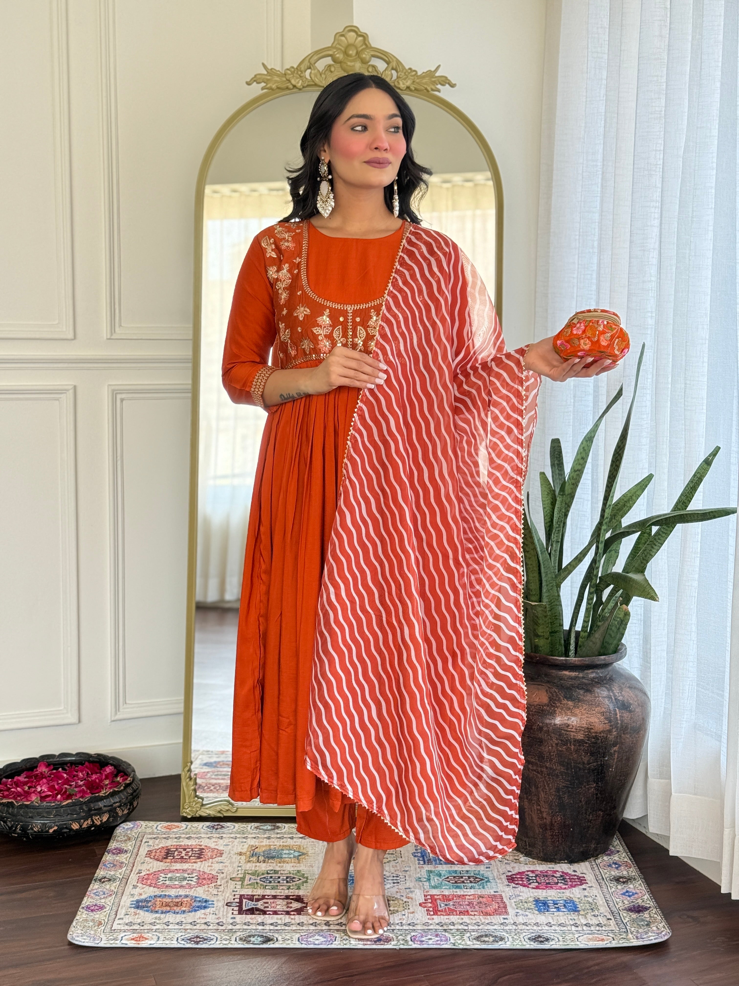 Title – Rust Orange Embroidered Kurta Set with Printed Dupatta