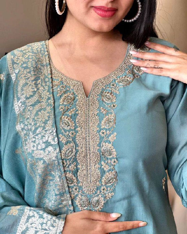 Description – Grace meets elegance in this teal blue kurta set. The soft silk fabric is adorned with intricate zari embroidery on the neckline, exuding traditional charm. Paired with a beautifully woven Banarasi dupatta showcasing floral motifs, this outfit is a perfect choice for festive gatherings and family celebrations.